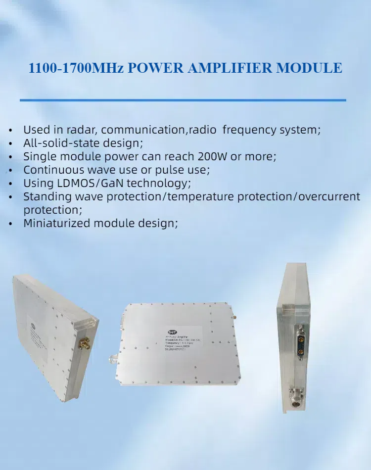 The 1100-1700MHz 200W RF Power Amplifier is a wideband high-power amplifier suitable for various applications, including wireless communication, radar systems, electronic warfare, and signal testing. This amplifier employs advanced design technology to ensure high efficiency, high gain, and stable output power.