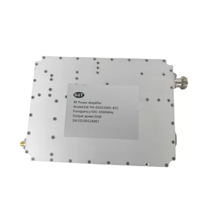 The 500-3000MHz 50W RF Power Amplifier is designed for a wide range of applications in communication systems, electronic warfare, radar systems, and test and measurement equipment. This amplifier covers a broad frequency range, making it versatile and suitable for various high-frequency and high-power applications. It delivers high efficiency, robust performance, and excellent linearity, ensuring reliable signal amplification across the entire bandwidth.
