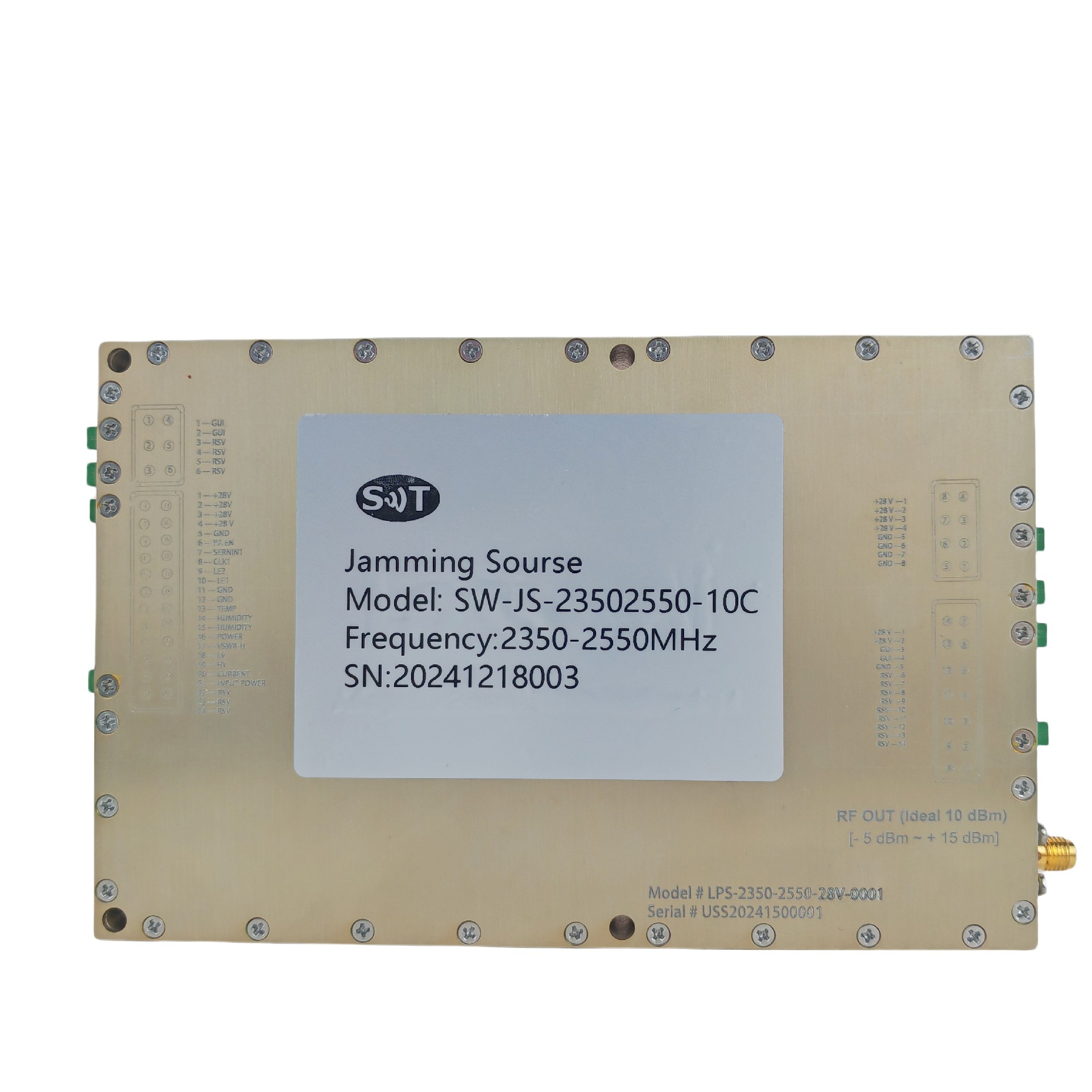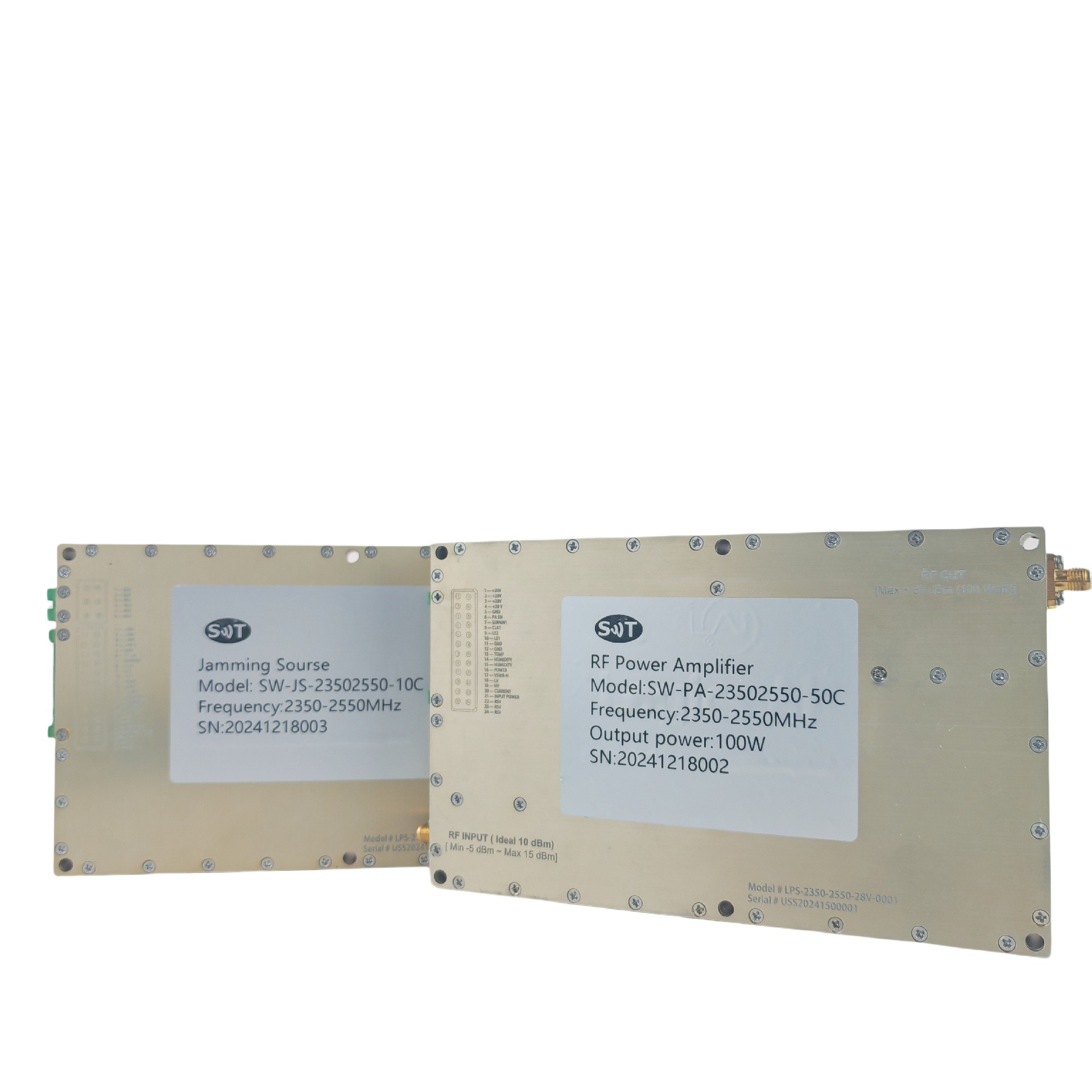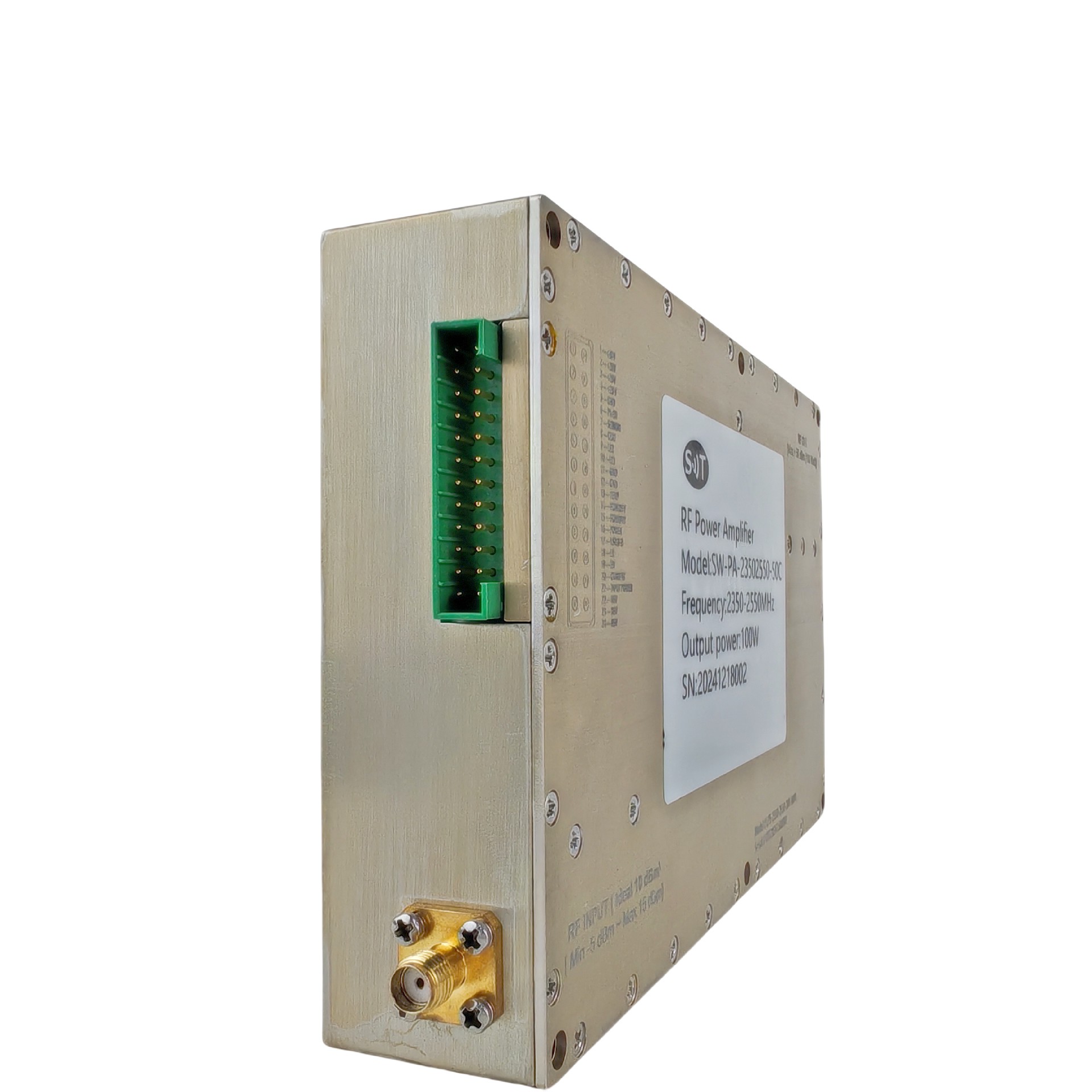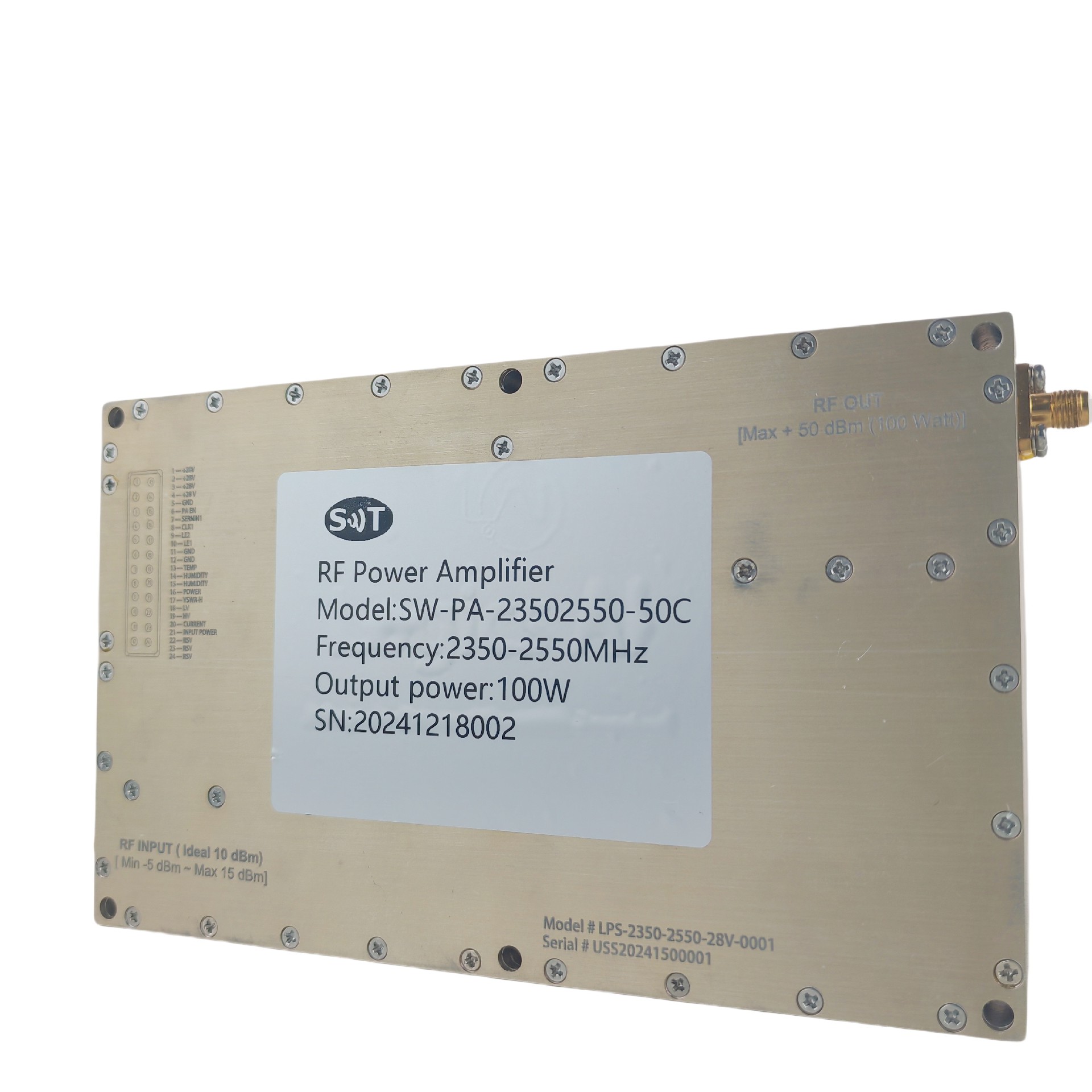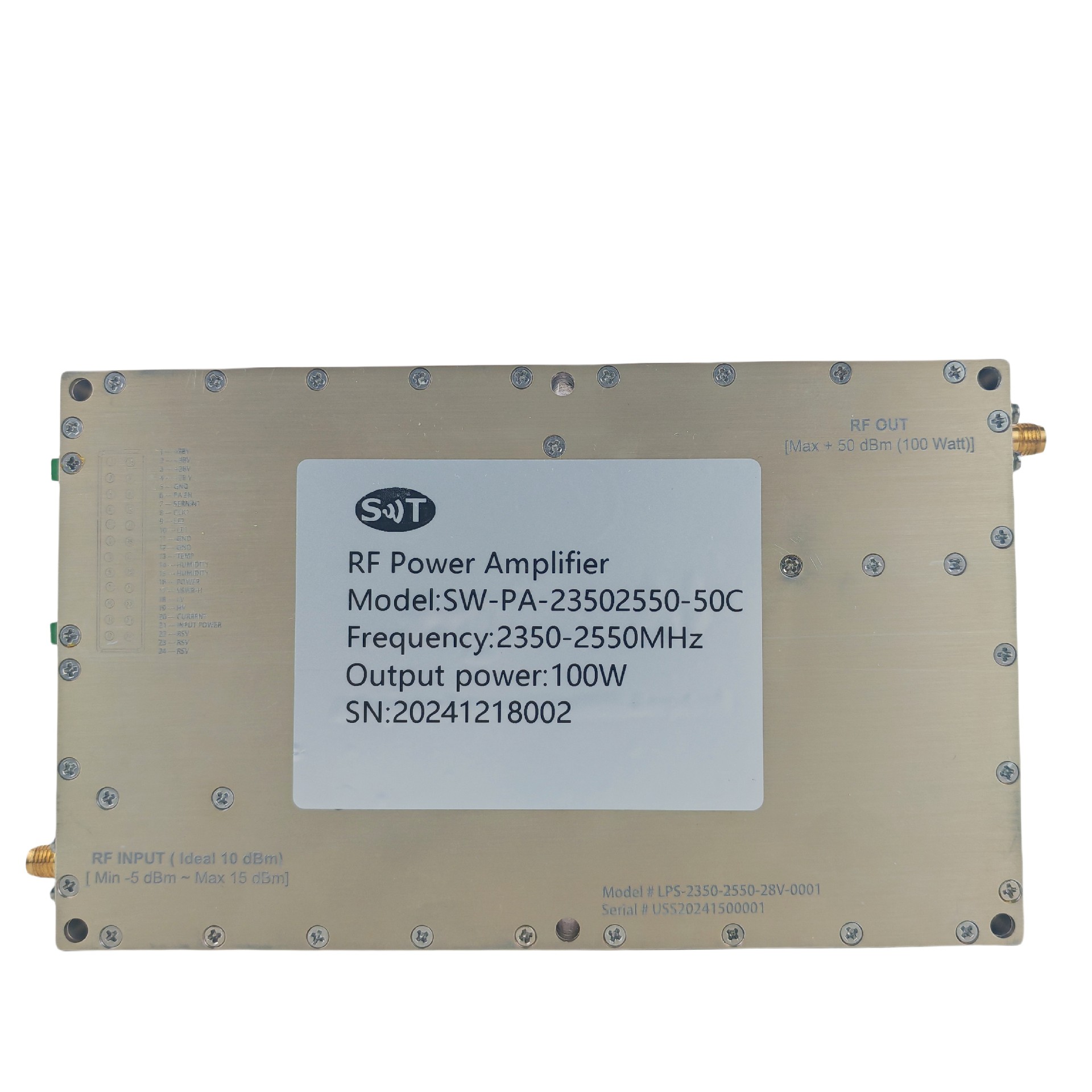 This RF power amplifier supports a frequency range of 2350-2550 MHz, suitable for signal amplification within this range. This frequency band is commonly used in wireless communication systems, radar, or microwave communication devices.
