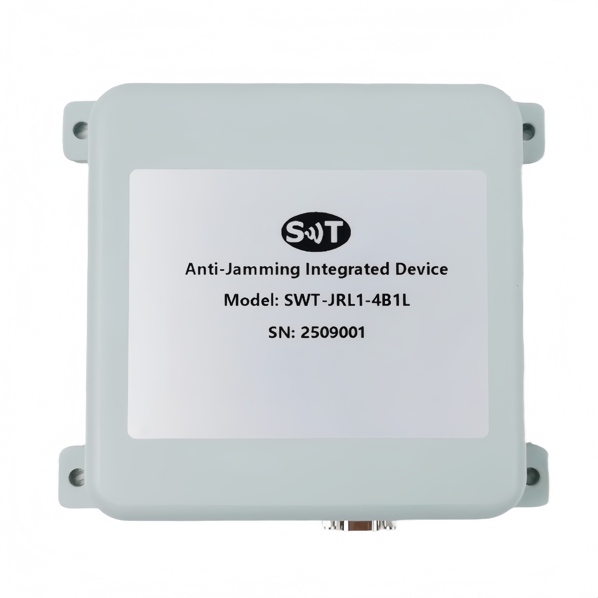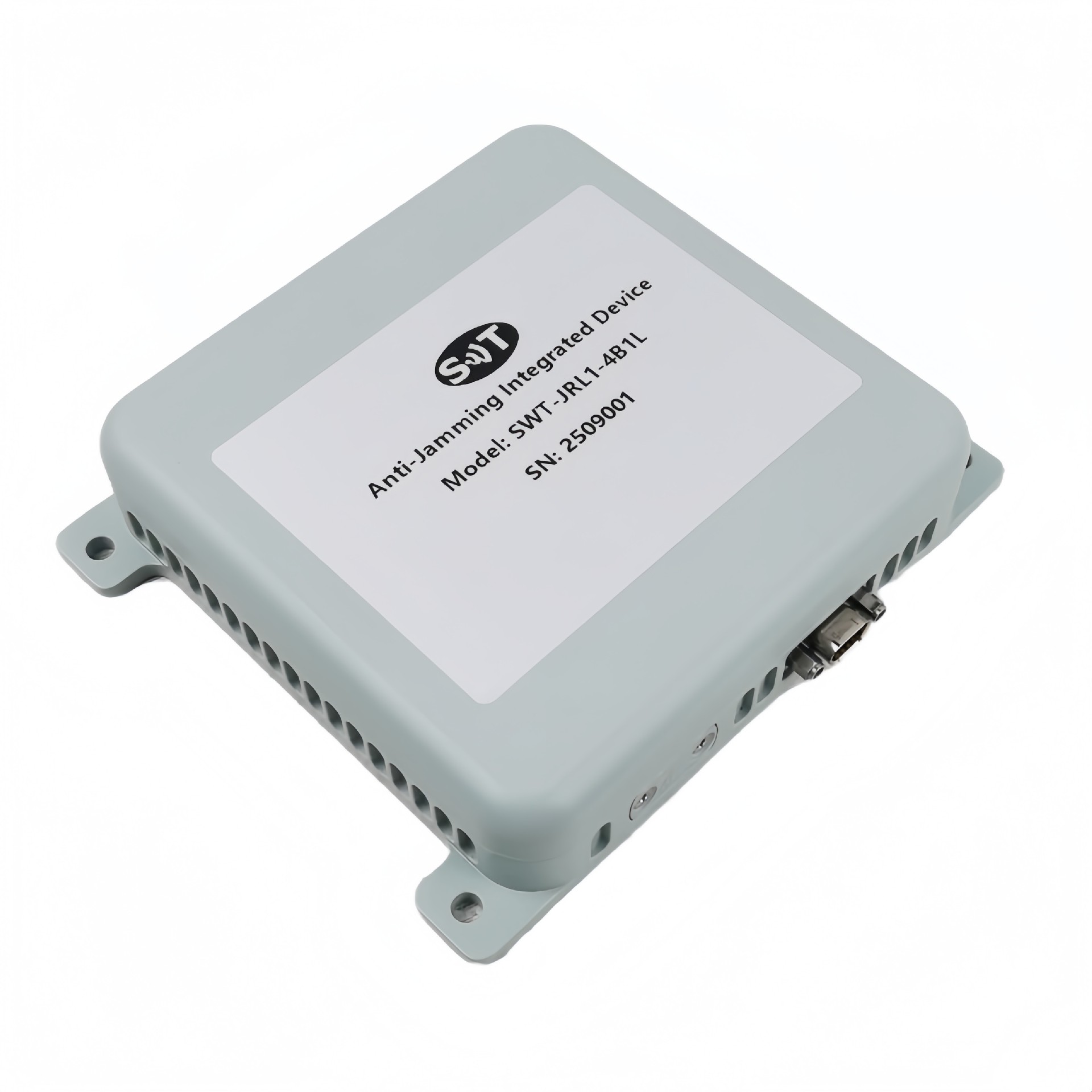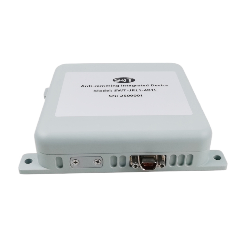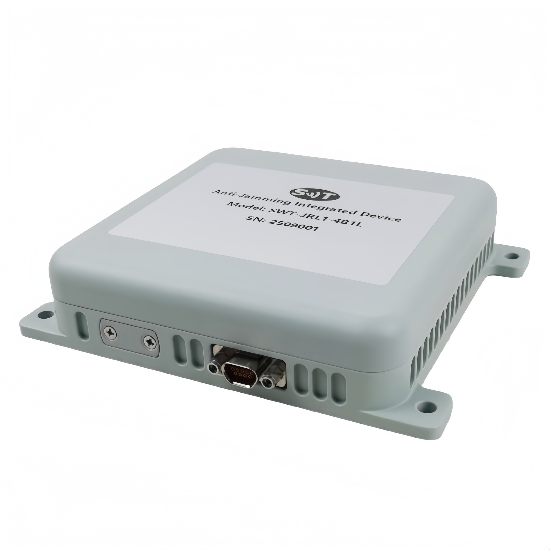 Anti-Jamming Integrated Device accomplishes the reception, amplification, down-conversion, filtering, and anti-jamming processing of 4-channel BDS_B1, GPS_L1, and GAL_E1 frequency signals. It operates with a power supply voltage range of +12V to +32V and consists of four components: an antenna array unit, an RF unit, an anti-jamming processing unit, and a receiver. The system provides anti-jamming capability against three wideband interferences, enabling high-precision positioning and accurate timing even in strong interference environments.