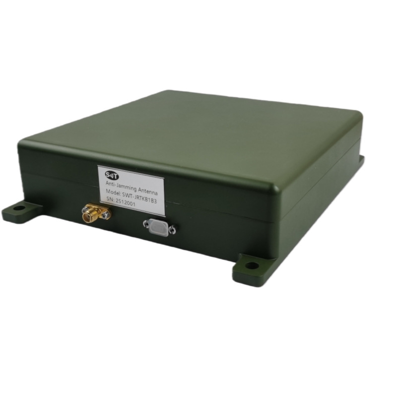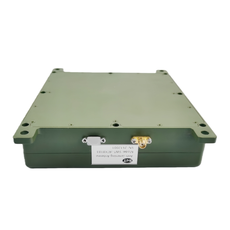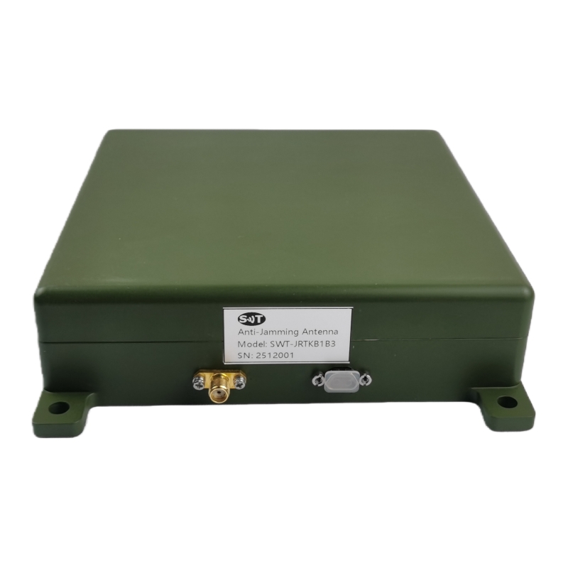 The anti-jamming antenna performs reception, amplification, down-conversion, filtering, and anti-jamming processing for 4 channels of BDS_B3, BDS_B1 frequency signals. It also supports automatic switching, reception, down-conversion, and amplification for 1 channel of high-precision BDS_B1 and BDS_B3 frequencies. The RF signals are combined and forwarded to the receiver. The unit operates with a wide voltage power supply and consists of three parts: the antenna array assembly, RF assembly, and anti-jamming processing assembly. It can counter three wide band interference sources. The product has low power consumption, can achieve direction-finding functionality under both interference and interference free conditions.