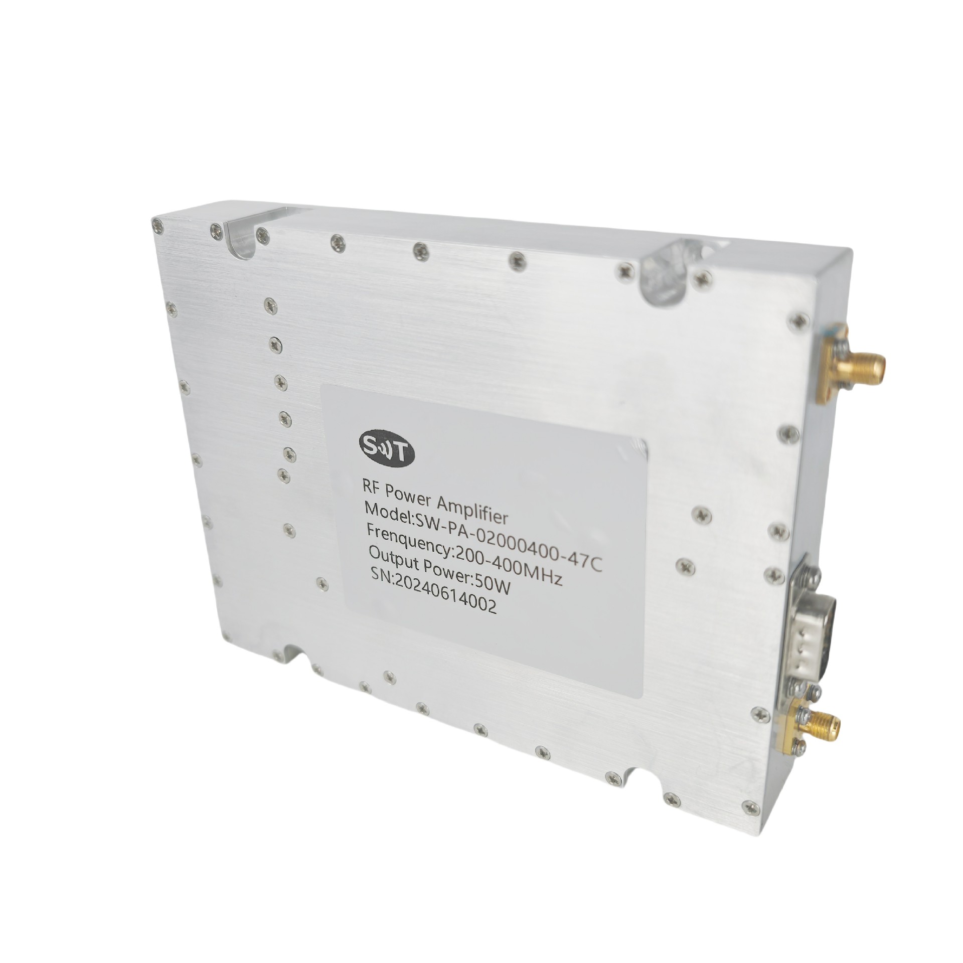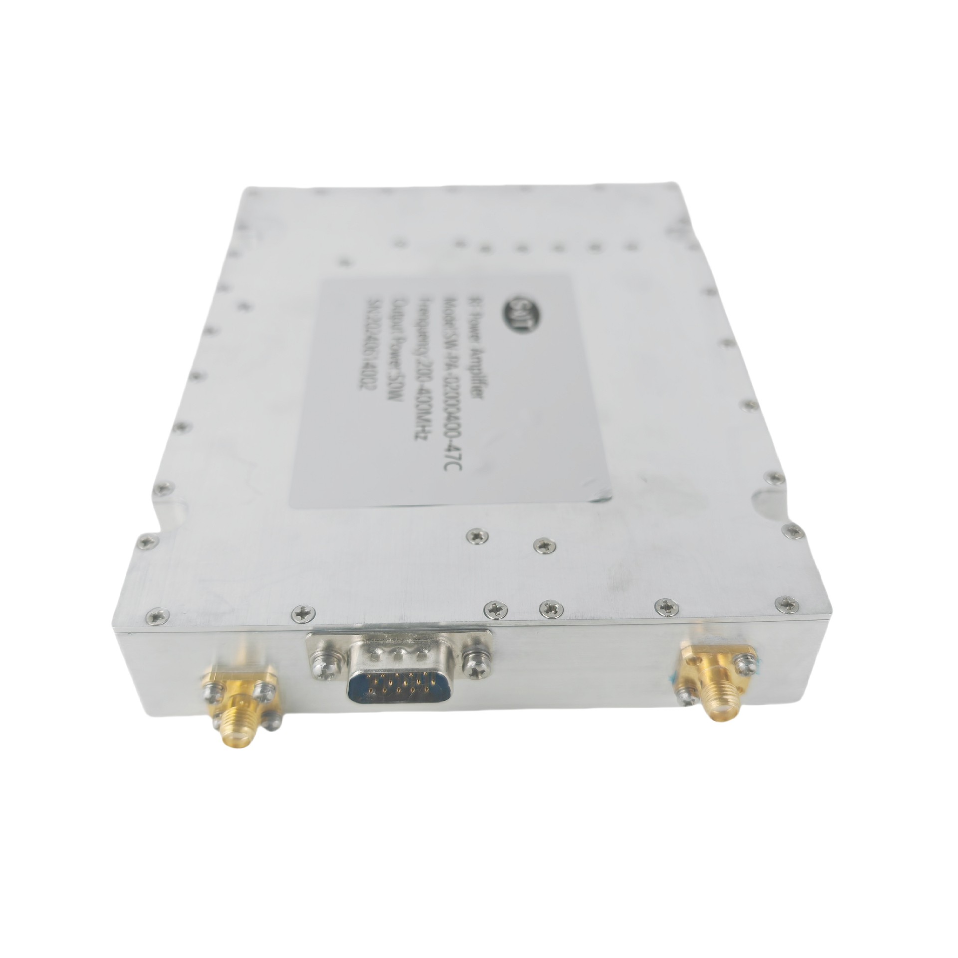 This product is a high-performance 200-400MHz 50W RF power amplifier, designed for various applications, including communication systems, testing equipment, and other scenarios requiring high reliability and high power output. Below are the main features and technical specifications of this product: