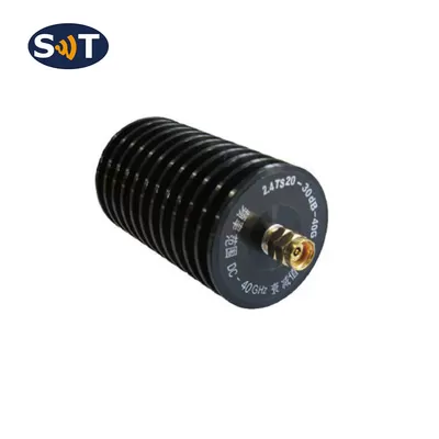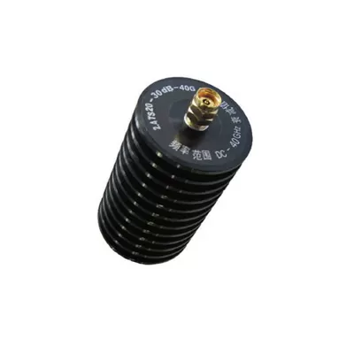 2.4TS20 coaxial fixed attenuator average power 20W, frequency range DC-40GHz. It has the following characteristics: wide working frequency band, low standing wave coefficient, flat attenuation value, strong anti-pulse and anti-burn ability.